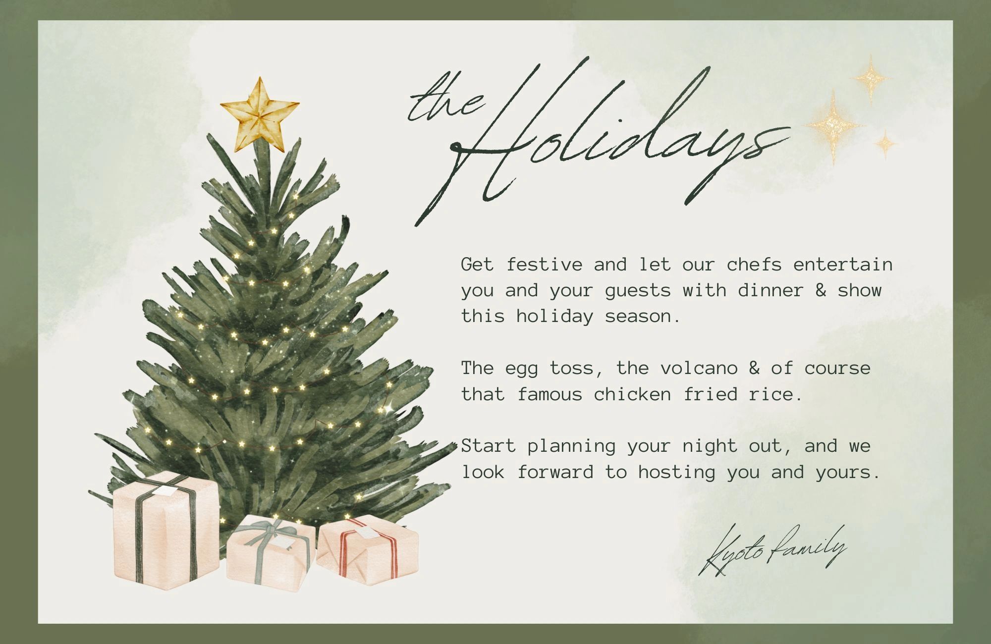 Reservations Required for Teppanyaki Dining. * please be advised we do not seat until your entire party is present and hold your reservation for 15mins. If OpenTable shows we are booked, please call Kyoto directly to double check.